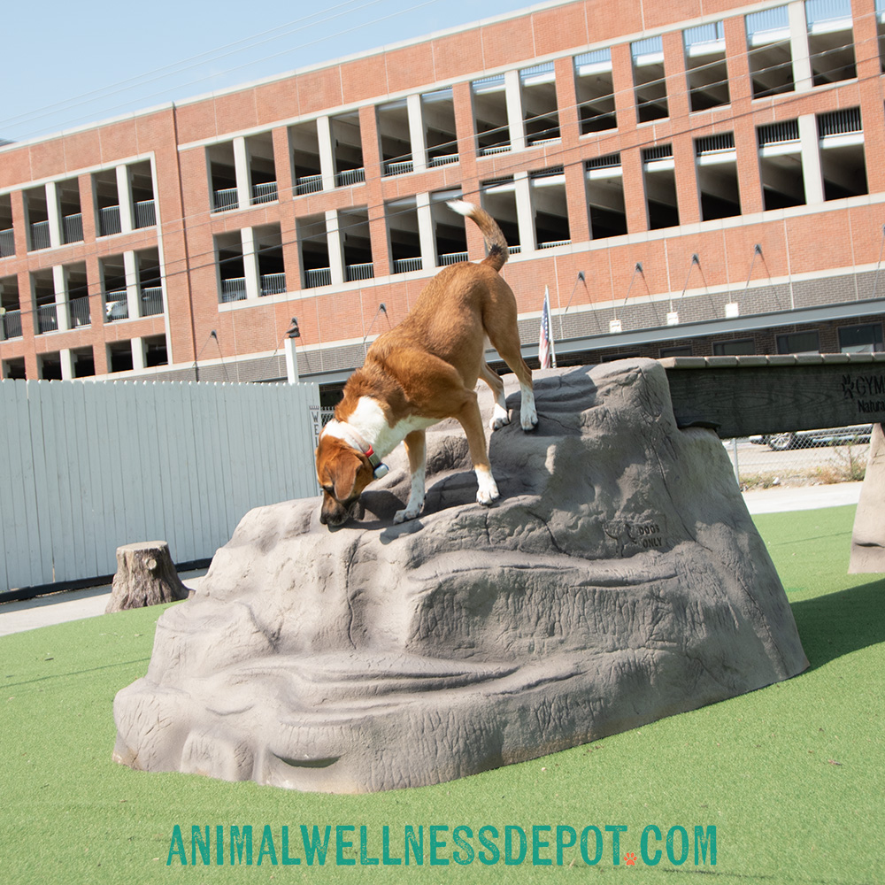 Ellie’s Boulder Bridge – Pro is a taller play structure that takes the concept of social and active play to new heights. This larger version of Ellie’s Boulder Bridge is designed to accommodate even more dogs, offering a grand and inclusive play experience within a luxurious setting. This taller version retains the natural-looking incline and decline features, creating a picturesque and engaging pathway for dogs to navigate. As they ascend the incline, the larger, natural-looking rocks provide a challenging yet inviting climb, leading them to a generously sized platform at the summit. Here, dogs can gather with other dogs for elevated interactions, whether it’s energetic play or simply enjoying the sunshine.