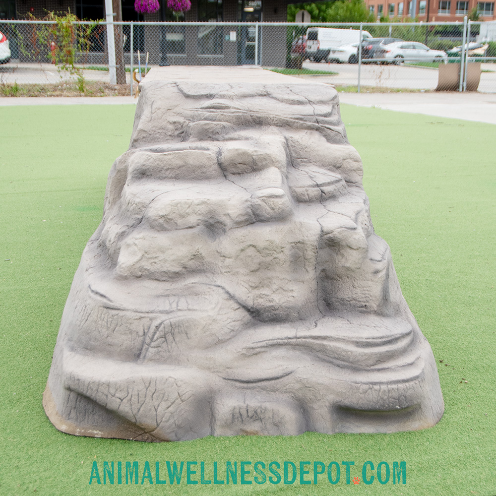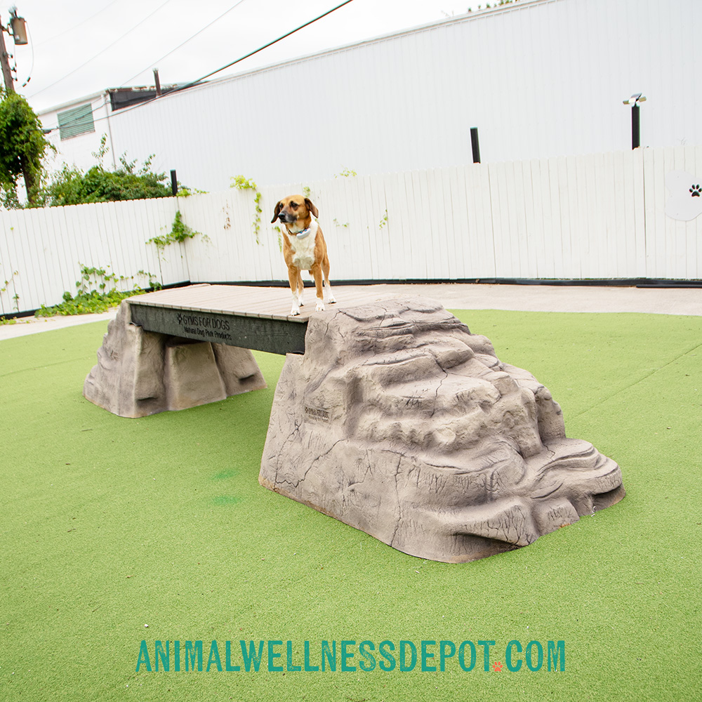 This larger version of Ellie’s Boulder Bridge is designed to accommodate even more dogs, offering a grand and inclusive play experience within a luxurious setting. This taller version retains the natural-looking incline and decline features, creating a picturesque and engaging pathway for dogs to navigate. As they ascend the incline, the larger, natural-looking rocks provide a challenging yet inviting climb, leading them to a generously sized platform at the summit. Here, dogs can gather with other dogs for elevated interactions, whether it’s energetic play or simply enjoying the sunshine.